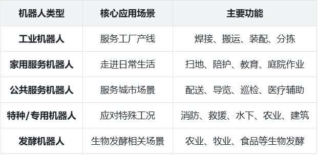 在很多人眼中,机器人经常与炫酷的人形、四足、跑酷、跳舞等形象关联。但实际上,机器人家族庞大、分工明确。按照应用领域划分,机器人可分为工业机器人、家用服务机器人、公共服务机器人以及特种/专用机器人等。